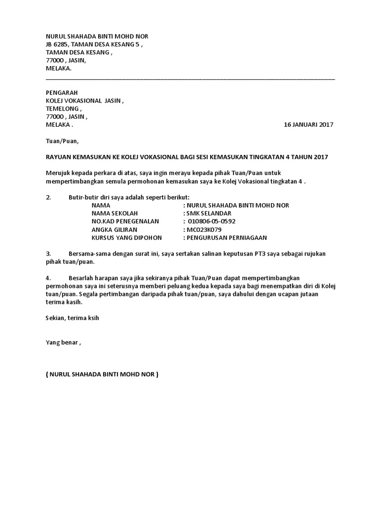Contoh Surat Rayuan Pertukaran Kolej Vokasional Dr 3 Ababyon
